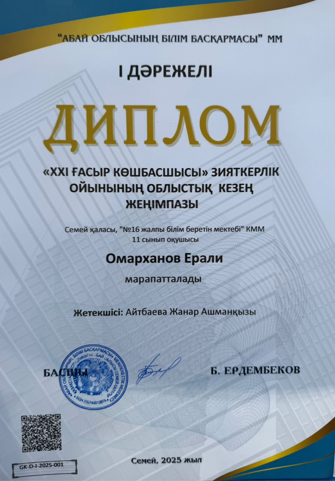 Білім додасында бақ пен бап таласқан сәтте өз білімімен, ұшқыр ойымен ерекшеленген шәкірттер ғана жеңіс тұғырынан көрінеді. Осындай дарынды оқушылардың бірі – 11-сынып оқушысы Омарханов Ерали. Ол «ХХІ ғасыр көшбасшысы» зияткерлік сайысының облыстық кезеңінде ең жоғары нәтижеге қол жеткізіп, бірінші орынды иеленді. Сайыс барысында қатысушылар логикалық ойлау, жедел шешім қабылдау, эрудиция мен жан-жақты білімді қажет ететін түрлі кезеңдерден өтті. Ерали барлық кезеңде үздік нәтиже көрсетіп, қарсыластарынан айқын басым түсті. Оның ерекше дайындық деңгейі, білімге деген ынтасы мен табандылығы жеңіске жеткізді.