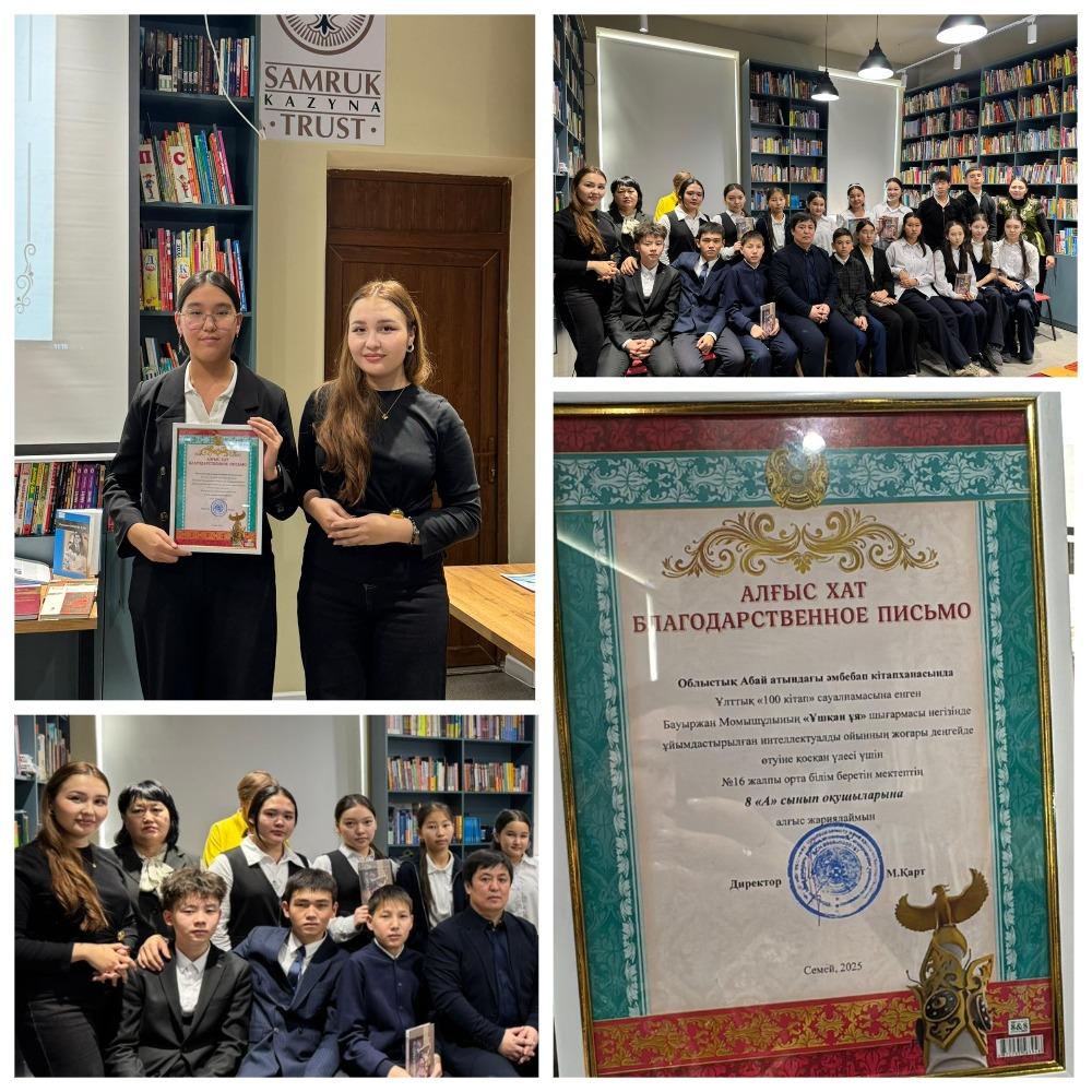 20.11 күні Абай атындағы облыстық әмбебап кітапханасының балалар әдебиеті бөлімінде “100 кітап” ұлттық сауалнамасы аясында Б.Момышұлының “Ұшқан ұя” шығармасы бойынша интеллектуалды ойын өтті. Аталмыш іс-шараға мектебіміздің 8 “А” сынып оқушылары қатысты. “Ұшқан ұя” шығармасы бойынша білім алушылар ойларын ортаға салып, ұйымдастырушылар тарапынан дайындаған тапсырмаларға жауап берді. Іс-шараның өтуіне белсенді қатысқандары үшін сынып оқушылары алғыс хатпен марапатталды.