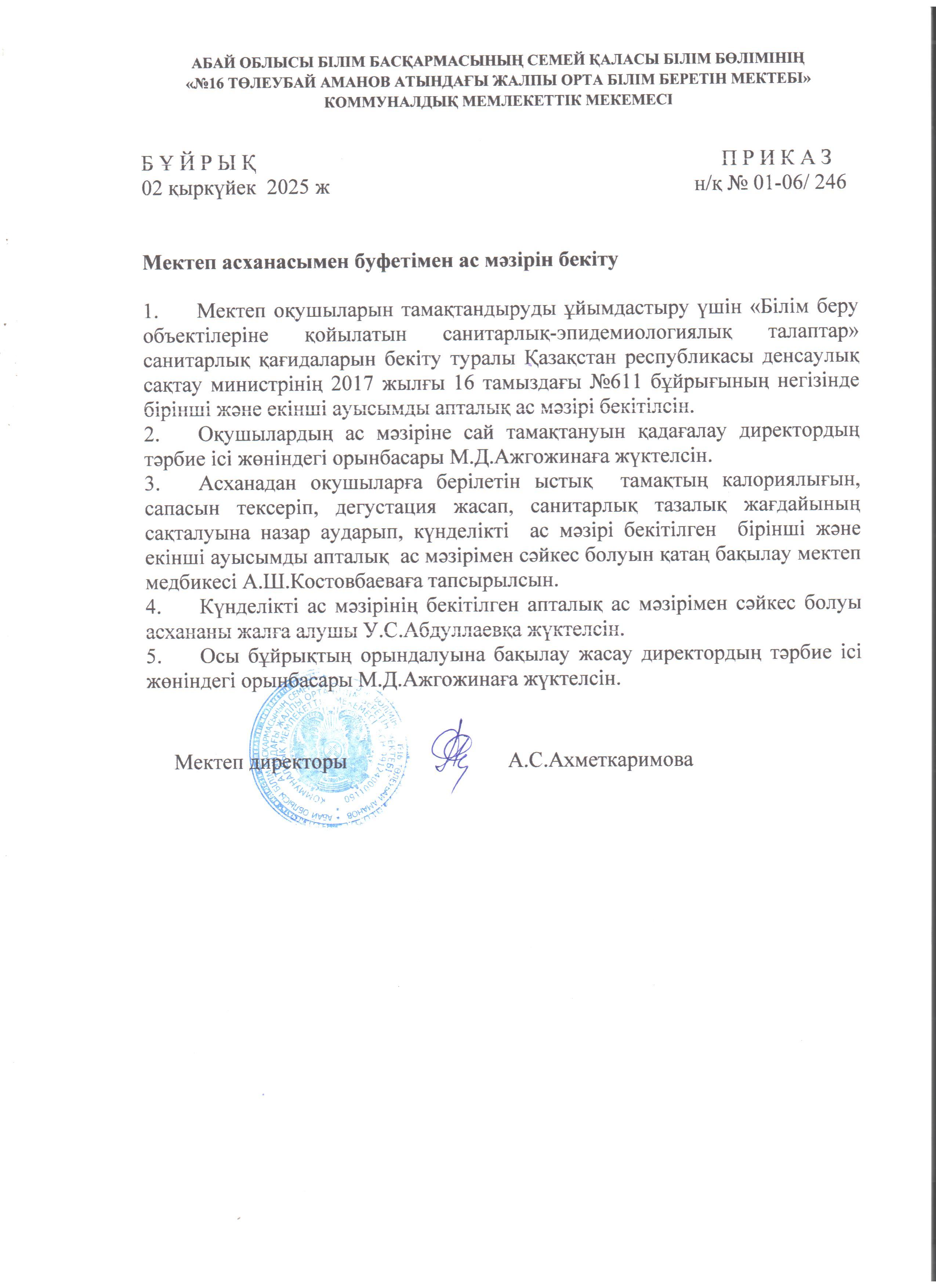 Мектеп асханасымен буфетімен ас мәзірін бекіту