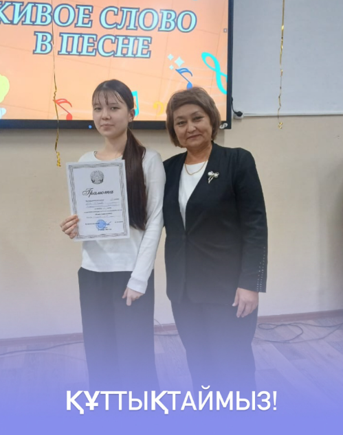 Орыс ақындарының өлеңдеріне арналған “Живое слово о песне” қалалық ән байқауында 9 “Ә” сынып оқушысы Солтанова Айым (жетекшісі - орыс тілі мен әдебиеті пәні мұғалімі, педагог-зерттеуші Б.А.Мустапанова) жүлделі ІІІ орынды иеленді. ҚҰТТЫҚТАЙМЫЗ!