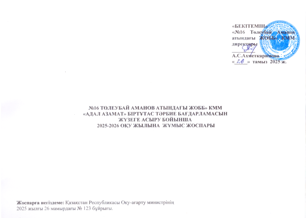 «АДАЛ АЗАМАТ» БІРТҰТАС ТӘРБИЕ БАҒДАРЛАМАСЫН ЖҮЗЕГЕ АСЫРУ БОЙЫНША 2025-2026 ОҚУ ЖЫЛЫНА ЖҰМЫС ЖОСПАРЫ